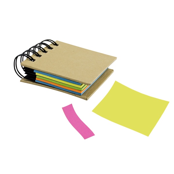 Set Ecológico de 180 post-it con Tapa Dura de Cartón 2mm. forrado en papel Kraft. Incluye 100 banderitas adhesivas de 5 colores (20 por color) + 80 post-it amarillos medianos de 4 colores (20 por color). Separadores de cartón reciclado negro.